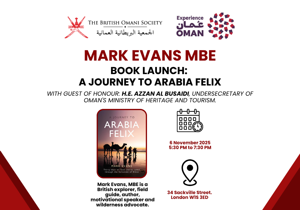 We are delighted to invite our members to celebrate the Book Launch of 'A Journey to Arabia Felix.' A new title charting Mark Evans thirty days on foot and by camel expedition through the Sultanate of Oman: a journey which commenced in January 2025 under the patronage of HRH Prince William and HRH Prince Theyazin of Oman.
