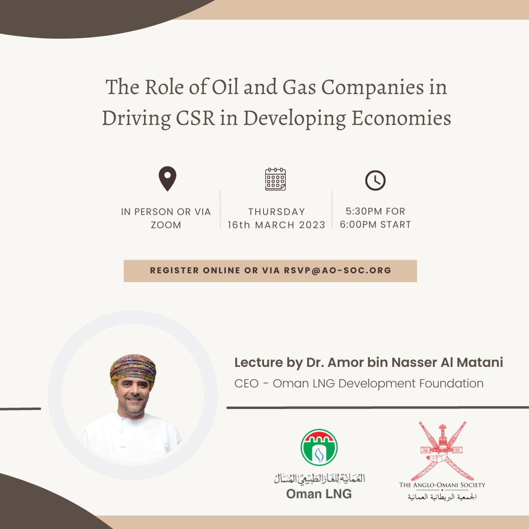 We are pleased to invite you to the British Omani Society for a hybrid lecture on the role of oil and gas companies in driving Corporate Social Responsibility (CSR) in developing economies. The lecture will be delivered by Dr Amor bin Nasser Al Matani, CEO of Oman LNG Development Foundation.