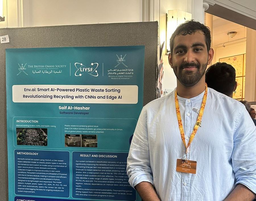 At the Science Bazaar, alongside brilliant young scientists from all over the world, I presented Env.ai, our AI powered system for sorting plastic waste. Sharing our vision of how artificial intelligence and computer vision can help solve plastic pollution was both challenging and rewarding. Many participants and professors were curious about how a project that started in Oman could grow and make an impact in other parts of the world.
